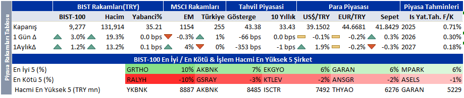 Düşük enflasyon verisi sonrası sene sonu enflasyon tahminimizi yarım puan indirerek 29,5’e çektik. Sene sonu politika faizimizi %35 seviyesinde. Dünya piyasalarının seyri Borsa İstanbul’da yatay pozitif bir açılışa işaret ediyor. Yabancı ağırlıklı kurumların banka alışlarında öne çıkması, hacimdeki artış ve pozisyonlanmanın düşüklüğü endeksteki yükselişin devam edebileceğine işaret ediyor. Enflasyon verisi sonrası Haziran toplantısı için aralanan faiz indirim kapısı endeksin yeniden 9.600-9.700 bandına yükselmesini sağlayabilir. Kısa vadede endeks içim destek ve direnç olarak 9.200 ve 9.400 öne çıkıyor.