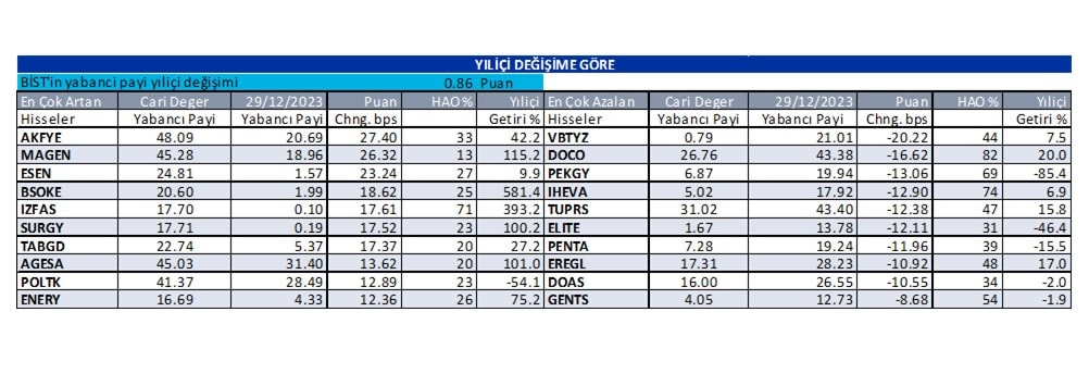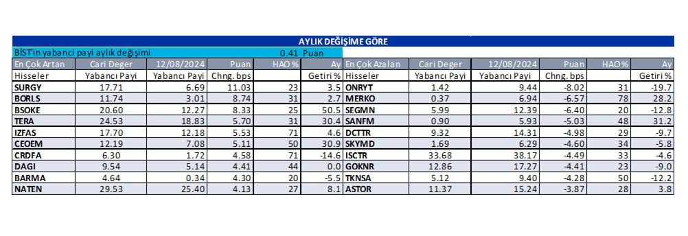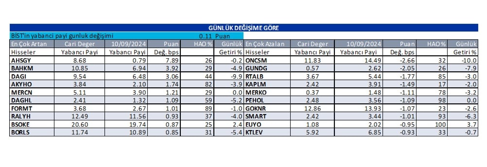 İş Yatırım raporunda şu ifadelere yer verildi; Bugün çıkan raporumuzda, günlük bazda yabancı oranı en çok artan hisseler; AHSGY:7.89 bps, BAHKM:3.92 bps, DAGI:3.06 bps, iken, azalan hisseler ise; ONCSM:-2.66 bps, GUNDG:-2.05 bps, RTALB:-1.77 bps. olarak görüntülenmektedir.