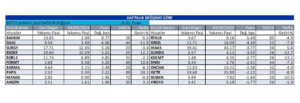 İş Yatırım Menkul Değerler A.Ş., haftanın dördüncü işlem günü olan 12 Eylül 2024 Perşembe günü için “Günlük Yabancı Oranları” raporunu yayınladı. Kurum, günlük yabancı oranı artan hisselerin yanında, yabancı oranı sürekli artan ve sürekli düşen hisselere de yer verdi. İşte detaylar…
