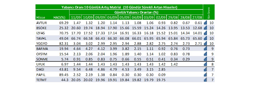 Son günlerde yabancı oranı sürekli artan hisselerden 5 tanesi; AVTUR:10 gün, BSOKE:10 gün, IZFAS:10 gün, TAVHL:10 gün, YGGYO:10 gündür yabancı oranları sürekli artış gösteriyor.