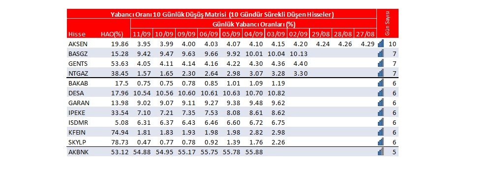Son günlerde yabancı oranı sürekli düşen hisselerden 5 tanesi; AKSEN:10 gün, BASGZ:7 gün, GENTS:7 gün, NTGAZ:7 gün, BAKAB:6 gündür yabancı oranları sürekli düşüş gösteriyor.