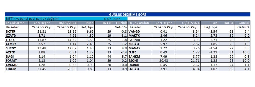 İş Yatırım Menkul Değerler A.Ş., haftanın son işlem günü olan 20 Eylül Cuma günü için “Günlük Yabancı Oranları” raporunu yayınladı. Kurum, günlük yabancı oranı artan hisselerin yanında, yabancı oranı sürekli artan ve sürekli düşen hisselere de yer verdi. İşte detaylar…