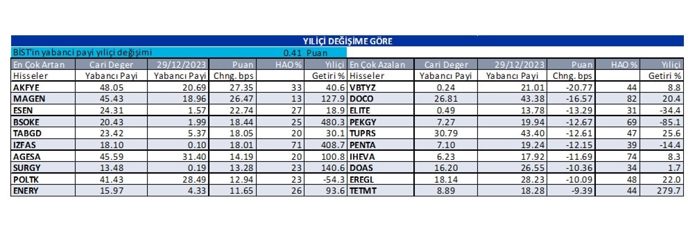Bugün çıkan raporumuzda, günlük bazda yabancı oranı en çok artan hisseler; DCTTR:6.69 bps, OZATD:4.5 bps, EFORC:3.55 bps, iken, azalan hisseler ise; VANGD:-3.54 bps, MAKTK:-2.78 bps, BARMA:-2.71 bps. olarak görüntülenmektedir.