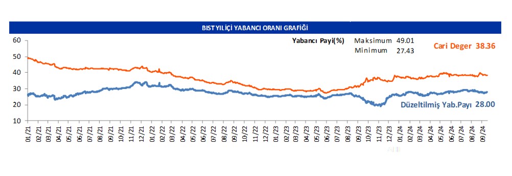 Borsanın yabancı payı günlük bazda -0.07 düşüşle 38.36 seviyesinde seyretmektedir.