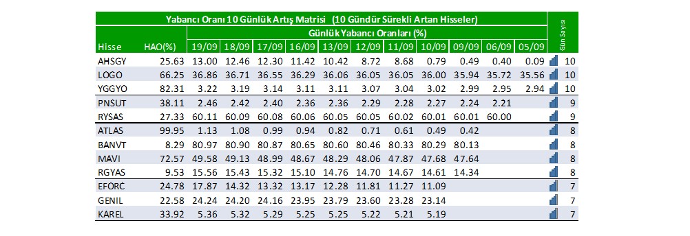Son günlerde yabancı oranı sürekli artan hisselerden 5 tanesi; AHSGY:10 gün, LOGO:10 gün, YGGYO:10 gün, PNSUT:9 gün, RYSAS:9 gündür yabancı oranları sürekli artış gösteriyor.