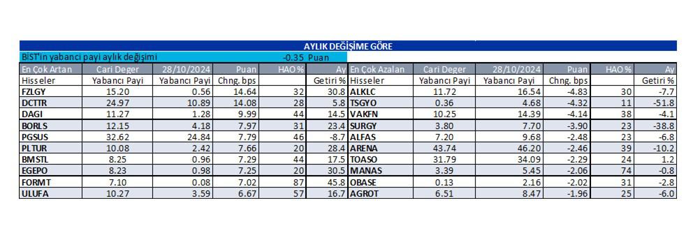 İş Yatırım Menkul Değerler A.Ş., haftanın ilk işlem günü olan 2 Aralık Pazartesi günü için “Günlük Yabancı Oranları” raporunu yayınladı. Kurum, günlük yabancı oranı artan hisselerin yanında, yabancı oranı sürekli artan ve sürekli düşen hisselere de yer verdi. İşte detaylar…