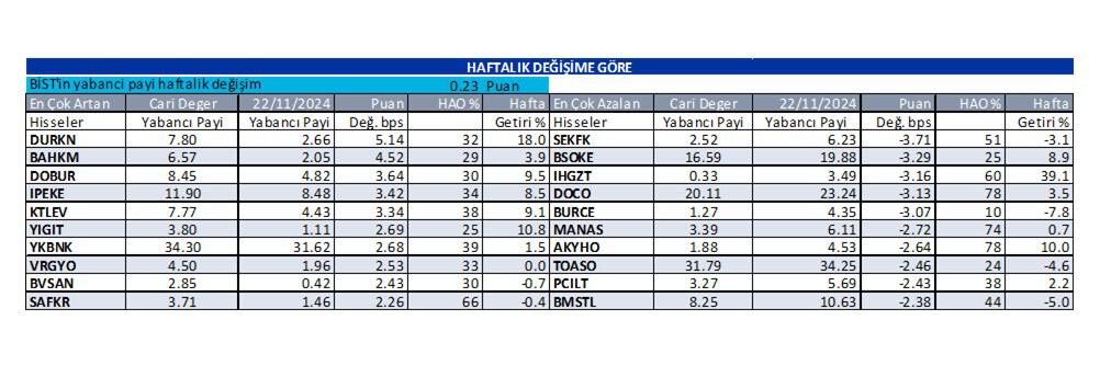 Bugün çıkan raporumuzda, günlük bazda yabancı oranı en çok artan hisseler; TCKRC:3.13 bps, KTLEV:1.4 bps, IPEKE:1.31 bps, iken, azalan hisseler ise; DURKN:-2.59 bps, AVGYO:-1.99 bps, AGROT:-1.97 bps. olarak görüntülenmektedir.
