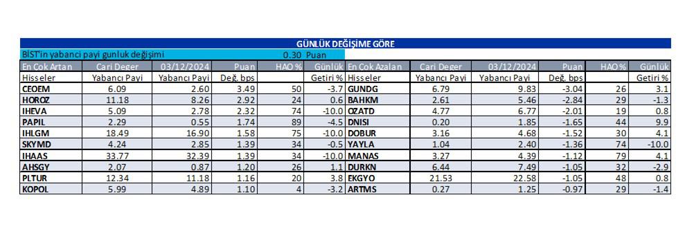 Bugün çıkan raporumuzda, günlük bazda yabancı oranı en çok artan hisseler; CEOEM:3.49 bps, HOROZ:2.92 bps, IHEVA:2.32 bps, iken, azalan hisseler ise; GUNDG:-3.04 bps, BAHKM:-2.84 bps, OZATD:-2.01 bps. olarak görüntülenmektedir.