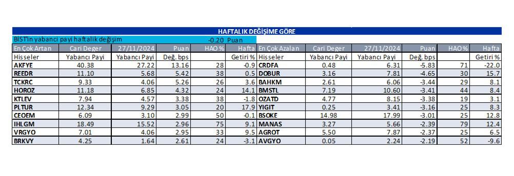 İş Yatırım Menkul Değerler A.Ş., haftanın dördüncü işlem günü olan 5 Aralık Perşembe günü için “Günlük Yabancı Oranları” raporunu yayınladı. Kurum, günlük yabancı oranı artan hisselerin yanında, yabancı oranı sürekli artan ve sürekli düşen hisselere de yer verdi. İşte detaylar…