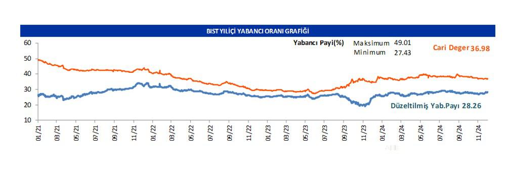 Borsanın yabancı payı günlük bazda 0.3 artışla 36.98 seviyesinde seyretmektedir.