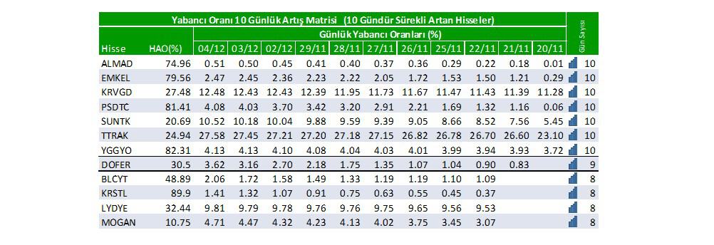 Son günlerde yabancı oranı sürekli artan hisselerden 5 tanesi; ALMAD:10 gün, EMKEL:10 gün, KRVGD:10 gün, PSDTC:10 gün, SUNTK:10 gündür yabancı oranları sürekli artış gösteriyor.