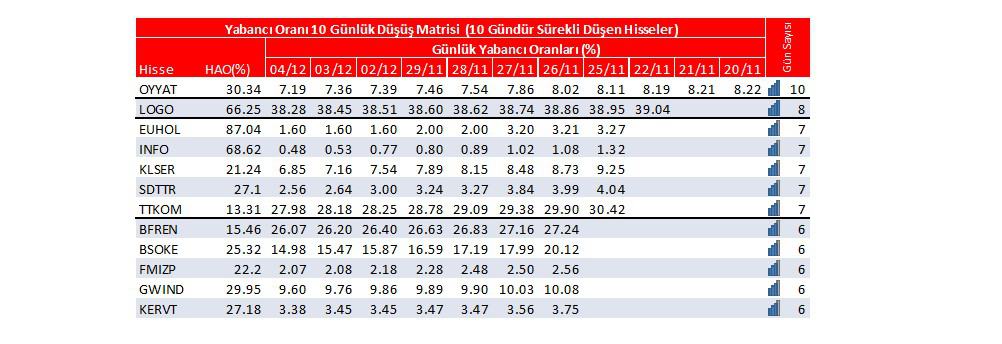 Son günlerde yabancı oranı sürekli düşen hisselerden 5 tanesi; OYYAT:10 gün, LOGO:8 gün, EUHOL:7 gün, INFO:7 gün, KLSER:7 gündür yabancı oranları sürekli düşüş gösteriyor.