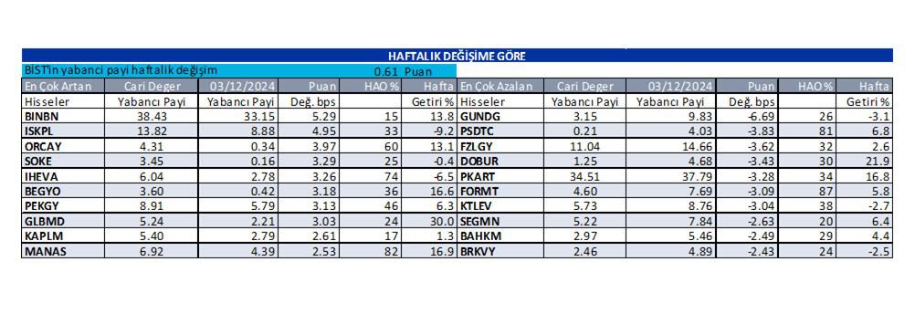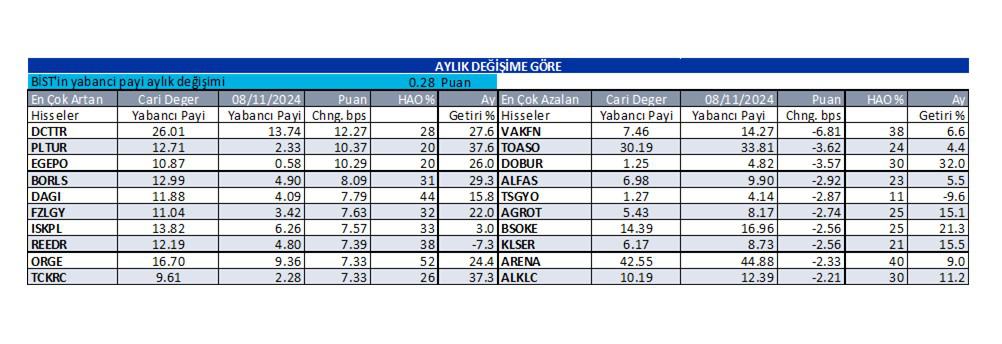 Bugün çıkan raporumuzda, günlük bazda yabancı oranı en çok artan hisseler; ORCAY:3.1 bps, DURKN:3.01 bps, PEKGY:2.5 bps, iken, azalan hisseler ise; SELGD:-2.63 bps, OZATD:-2.28 bps, PKART:-2.22 bps. olarak görüntülenmektedir.