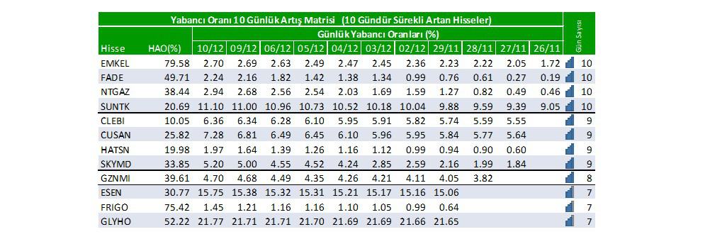 Son günlerde yabancı oranı sürekli artan hisselerden 5 tanesi; EMKEL:10 gün, FADE:10 gün, NTGAZ:10 gün, SUNTK:10 gün, CLEBI:9 gündür yabancı oranları sürekli artış gösteriyor.