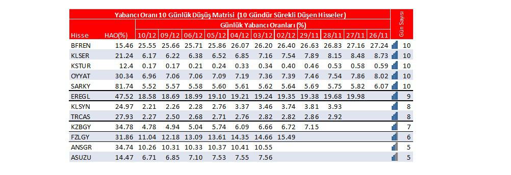 Son günlerde yabancı oranı sürekli düşen hisselerden 5 tanesi; BFREN:10 gün, KLSER:10 gün, KSTUR:10 gün, OYYAT:10 gün, SARKY:10 gündür yabancı oranları sürekli düşüş gösteriyor.