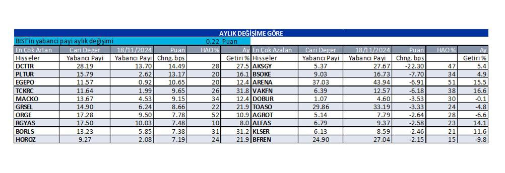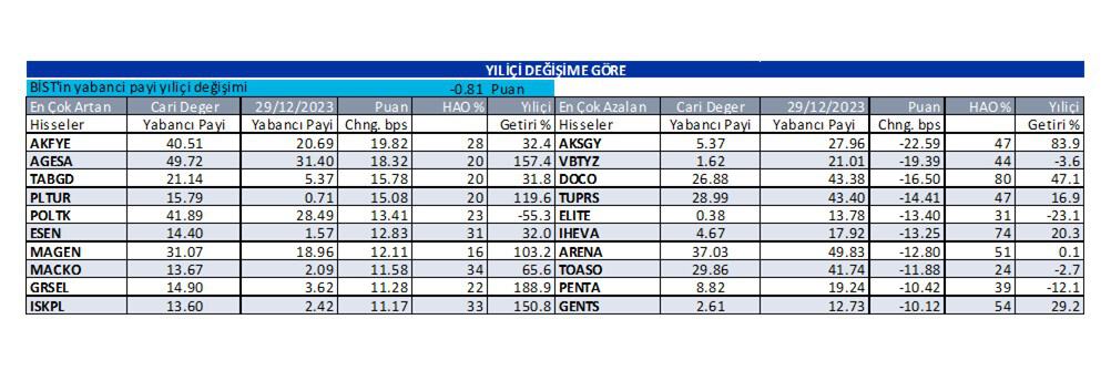 İş Yatırım Menkul Değerler A.Ş., haftanın dördüncü işlem günü olan 19 Aralık Perşembe günü için “Günlük Yabancı Oranları” raporunu yayınladı. Kurum, günlük yabancı oranı artan hisselerin yanında, yabancı oranı sürekli artan ve sürekli düşen hisselere de yer verdi. İşte detaylar…