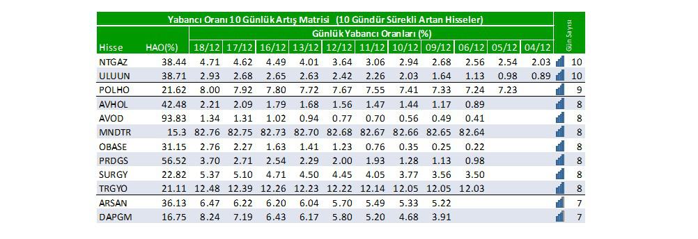 Son günlerde yabancı oranı sürekli artan hisselerden 5 tanesi; NTGAZ:10 gün, ULUUN:10 gün, POLHO:9 gün, AVHOL:8 gün, AVOD:8 gündür yabancı oranları sürekli artış gösteriyor.