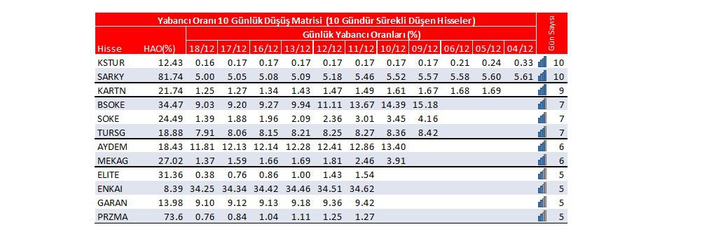 Son günlerde yabancı oranı sürekli düşen hisselerden 5 tanesi; KSTUR:10 gün, SARKY:10 gün, KARTN:9 gün, BSOKE:7 gün, SOKE:7 gündür yabancı oranları sürekli düşüş gösteriyor.